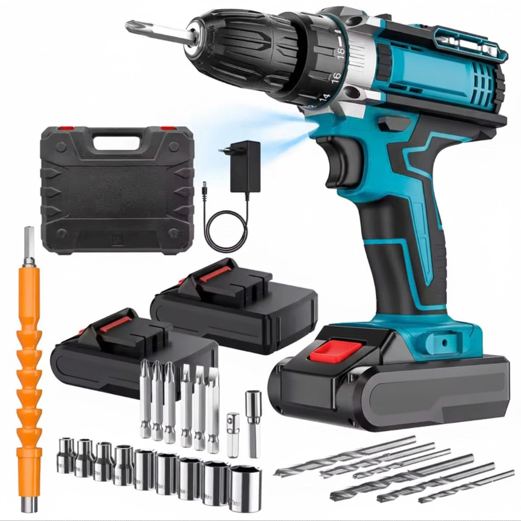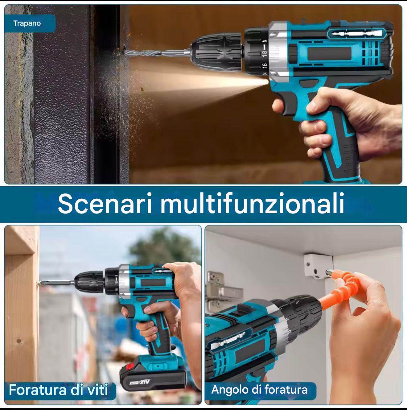 【2 velocità variabili e 25+3 impostazioni di coppia】 Il trapano può essere impostato su due diverse gamme di velocità (alta/bassa) e il trapano a batteria ha 3 modalità di lavoro: avvitamento, foratura a percussione e foratura. Inoltre, il trapano a batteria dispone di 25 posizioni di coppia per le opzioni di serraggio, per soddisfare un'ampia gamma di esigenze di foratura e avvitamento di viti in legno, metallo e plastica. 【Batteria agli ioni di litio da 2.0ah e caricatore a ricarica rapida 】 Il trapano a batteria è dotato di una batteria agli ioni di litio ricaricabile da 21V 2000mAh e di un caricatore a ricarica rapida. 【Controllo Avanti/Riserva】 Commutazione avanti/indietro con un solo tocco. L'interruttore avanti/indietro consente di stringere o cambiare/rimuovere le punte al vostro scopo, nonché di bloccare il trapano elettrico, facilitando il vostro lavoro di bricolage. 【Facile da usare】 Il mandrino autobloccante da 3/8" (10 mm) consente di cambiare rapidamente le punte. Il cacciavite elettrico è progettato ergonomicamente per offrire una presa antiscivolo. La luce LED incorporata aiuta a lavorare in ambienti bui. Viene fornito con una custodia per il trasporto per raccogliere gli strumenti. 【Ampia gamma di applicazioni】 Questo set di trapani a batteria contiene 24 pezzi, tra cui 6*punte per cacciavite; 3*punte per rotazione; 3*punte per torsione; 1*asta flessibile per trapano; 9*chiave a bussola 5,5-13 mm; 1*fissaggio; 1*supporto per cacciavite esagonale.