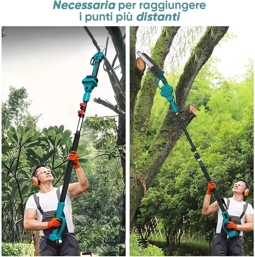 Un kit multifunzione ideale per la cura completa del tuo giardino, frutteto o vigneto. Questo set 4 in 1 include tutto cio' che serve per potature rapide, precise e sicure: motosega elettrica da 8" con lubrificazione automatica della catena, cesoia elettrica con capacita' di taglio fino a 40 mm, lampada LED ad alta intensita' per lavorare anche in zone poco illuminate, e un' asta telescopica per raggiungere rami alti senza l'uso di scale. La motosega e' leggera e maneggevole, perfetta per rami medi e grossi. La cesoia da 500W e' ideale per tagli netti su rami spessi fino a 40 mm, grazie a lame robuste in acciaio. La lampada LED assicura visibilita' in ogni condizione. Il kit include due batterie al litio da 88VF 8Ah per un'autonomia continua di 2-3 ore per dispositivo. L' asta telescopica permette di montare la motosega o la lampada, estendendo la portata del lavoro in altezza.