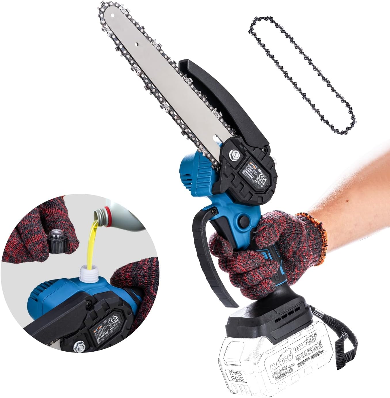 - Catena in lega rinforzata: La mini motosega presenta una catena rinforzata realizzata in acciaio, noto per la sua elevata resistenza, durezza, elasticità e resistenza all'usura. Potenziata da un processo di tempra profonda, garantisce tagli puliti e fluidi con prestazioni ottimali.